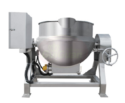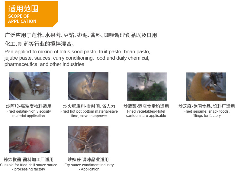本產(chǎn)品鍋體為一次沖壓成型的半球不銹鋼鍋體,采用電加熱、蒸汽加熱、燃氣加熱,攪拌方式采用特殊的傾斜傳動,使用的行星攪拌器與鍋體充分接觸,實現(xiàn)傳動公轉與自轉的不整數(shù)傳動比,使鍋內無攪拌死角。使用先進的傳動與密封結構,使傳動部分與鍋內潔凈、衛(wèi)生。采用變頻調速動力,運行更平穩(wěn)。電磁加熱形式打破了明火烹調方式,具有升溫快、無明火、無煙塵、無有害氣體,對周圍環(huán)境不產(chǎn)生熱輻射,安全性好和外觀美觀等特點,是性能優(yōu)良的食品加工設備。